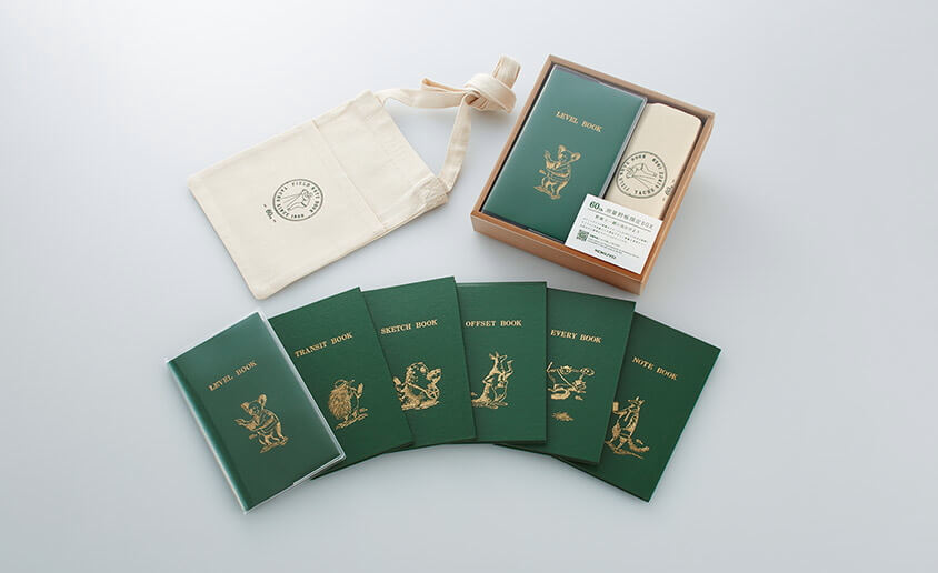 「測量野帳60周年限定ボックス」には限定デザインの測量野帳6種類と、「測量野帳用クリアカバー」、60周年ロゴマーク入りの非売品サコッシュバッグがセットになっている。