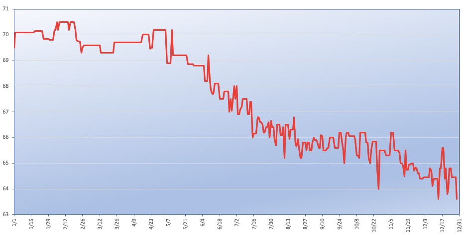 今年一年の体重の変化をグラフにしてみたが、元旦から2月にかけて70キロを超えていた体重が、5月から8月にかけて4kg落ち、10月末から年末にかけてさらに2kg落ちた。1年で6kg体重を落としたのだが、食事を減らすこともなく健康的にダイエットできたのは嬉しい限りだ。