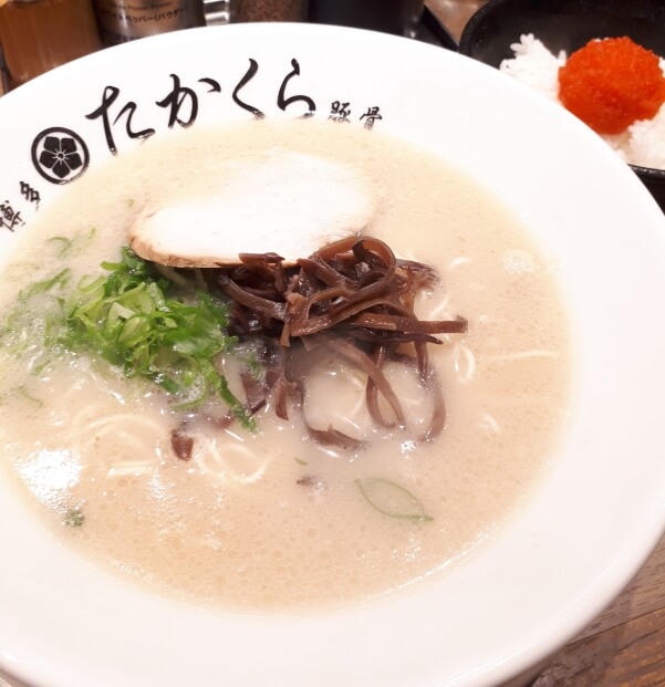 今回食べたのは「博多豚骨たかくら」の「一番釜・明太鼓ご飯セット」。博多豚骨ラーメンと明太子ご飯のセットは最強。替え玉一個が無料なのだが、今回は替え玉なしでごちそうさま!美味しくいただいて元気をチャージさせていただいた。やはり、豚骨ラーメンは私の細胞を元気にしてくれるようだ。