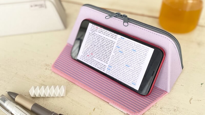 横にも縦にもスマホを置くことが出来るが、スマホを置いてもペンケースの中身を取り出せるようになっているのが特徴だ。ちょっとしたことながら、この仕様はとても便利だなと思う。