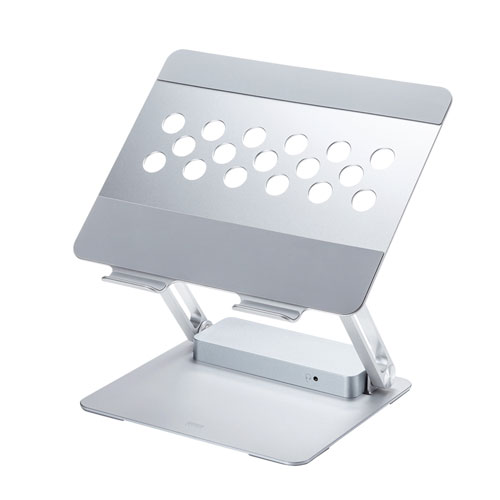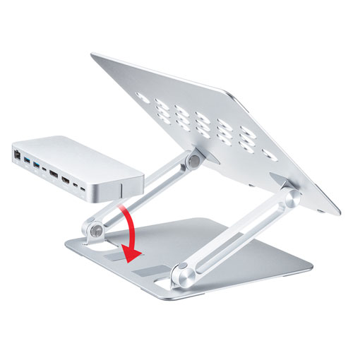 ドッキングステーションとPCスタンドはもともと別商品となっていて、組み合わせることでケーブル一本でノートPCにさまざまな機器を接続して使うことができる。また、PCスタンドはアルミ製で放熱穴があけられているので、ノートPCの熱を逃してくれるのも便利だ。