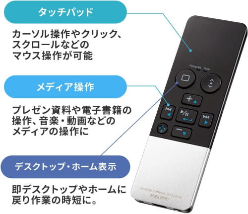 マウスの上部にはタッチパッドがついていて、指先でカーソルを操作できるのでボタン操作で動かすタイプよりも操作が簡単そうだ。また、メディア操作やデスクトップに戻るボタンなどもついているので、いちいちプレゼン用のパソコンで操作する必要がなく、スムーズなプレゼン操作を行うことができるようになっている。