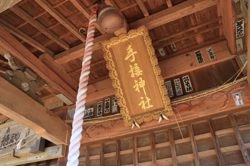 この神社は河童を祀ったという伝説がある。昔、お殿様が馬を川に引き込もうとしていた河童の手を刀で切り、手を返してほしいと懇願した河童に手を返した。そのお礼に河童は魚を届けるようになったが、ある日魚を持ったまま死んでいた。それを哀れに思った殿様が河童を祀ったのが「手接神社」なのだとか。