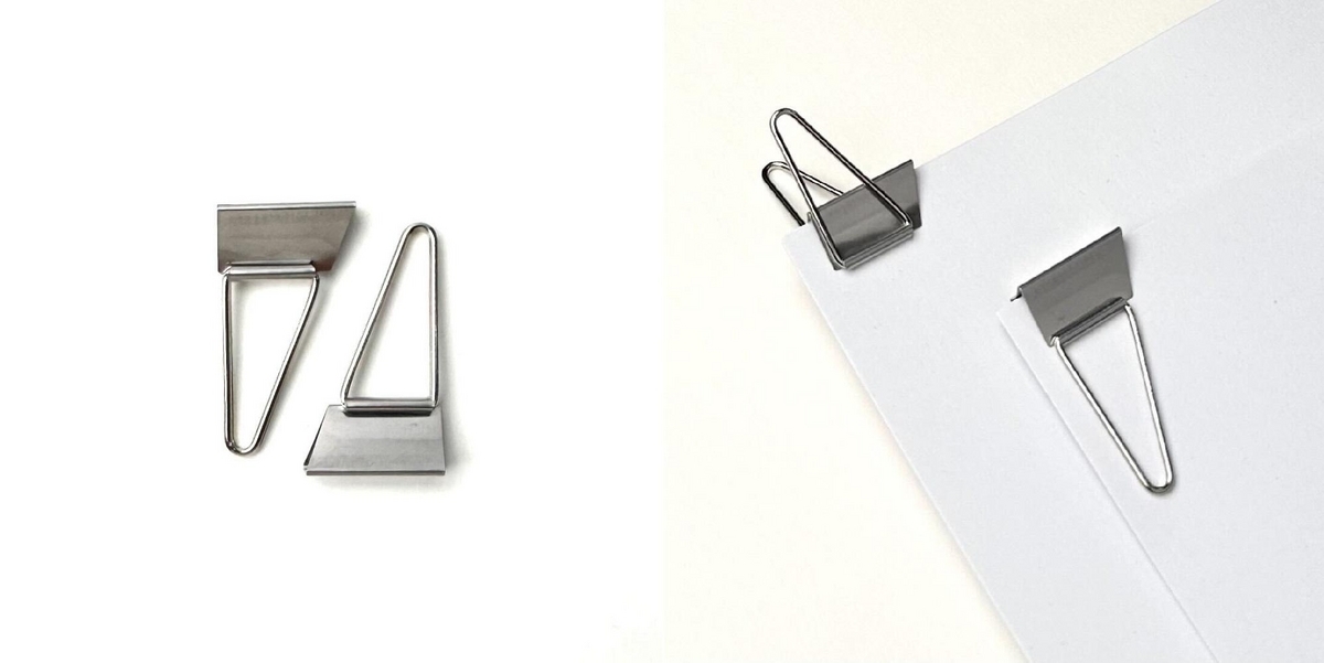 この商品は、「コクヨデザインアワード2018」で優秀賞を受賞した豊福 昭宏氏の作品を商品化したものだ。紙をめくる時に角に生まれる三角形の余白とクリップの形状を揃えることで、邪魔にならずガイドとしても機能させる新しいダブルクリップが登場することになった。 商品化にあたっては単に形状を変えるだけでは機能的に課題が残るため、紙を挟む板バネと指でつまむ線バネの装着方法を見直すなど約4年半にわたる試行錯誤をおこなったのだそうだ。