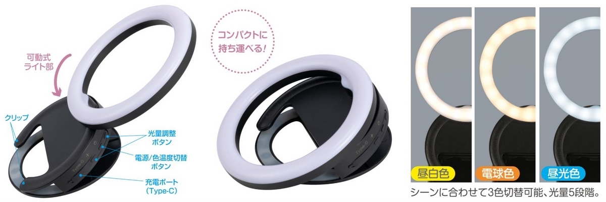 このリングライトは重量が約75gと軽量なうえに、ライト部分が水平方向に180度可動するためコンパクトに持ち運びすることができる。リング型のLEDライトは、光量5段階×色温度3段階で15パターンの調光機能を備えている。
