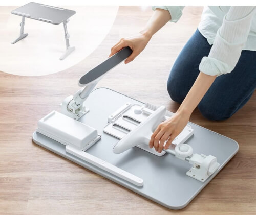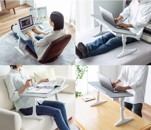 テーブルは足を起こすだけですぐに使えるコンパクト設計だ。天板の高さは29cmから41cmまでなのでかなり低いが、座って作業を行なったりベッドの上に乗せて使ったりするのには向いているだろう。