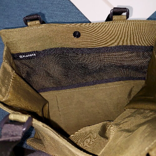 フラットートの内側にはメッシュ素材の内ポケットが付いていて、コードや充電器などの小物が入れられるようになっている。そのため、フリーアドレスのオフィスや、在宅勤務などの自宅内での移動時にはコード類をひとまとめにして持ち歩ける。コンパクトに折りたためるので常にバッグに入れてあり、いつでもさっと取り出せて使える便利な商品だ。