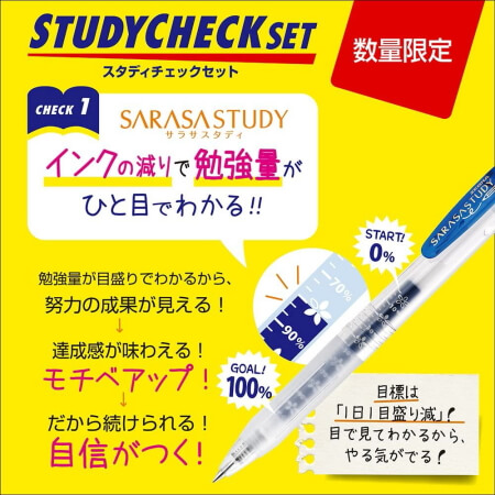 ゼブラが発売しているのが、「ジェルボールペン スタディチェックセット」という商品。ボディが透明なのでボールペンの芯が見えやすく、また芯に目盛りが付いているので、インクの減り具合が一目でわかるようになっています。テキストを読んでメモをしたり、過去問を解いたりすると当然インクが減ってきますが、それを実感することで達成感につながるという仕組みなんです。