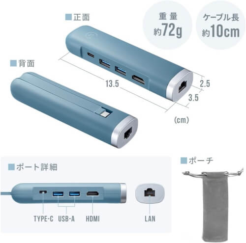 重量は約72gと軽量。ケーブル長は10cmで背面に収納できるようになっているのでコンパクトだ。