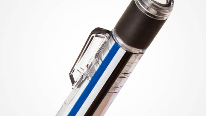 ノックは親指で芯出しするサイドスライドノック方式。長さ19㎜、幅5㎜のショートサイズと、筆記中に手の甲にあたらないように工夫されている。ボタンは滑りにくいラバータッチ仕上げ。ペンの転がりも防いでくれる。